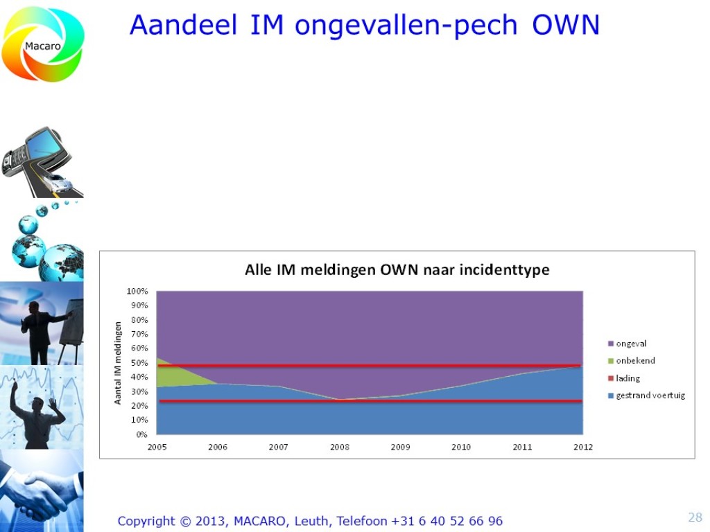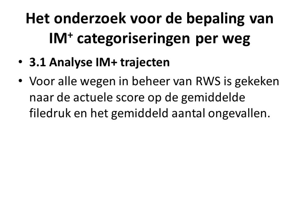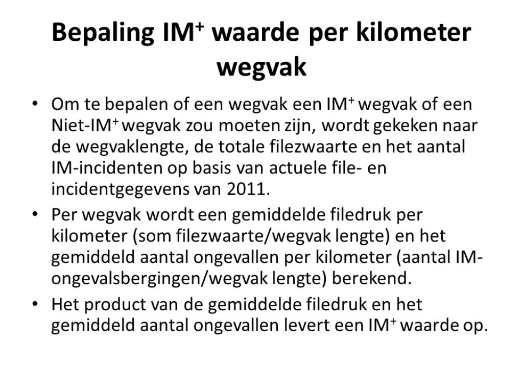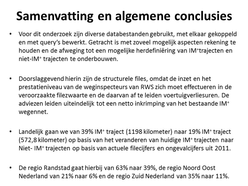 Gezien de taakstelling voor Rijkswaterstaat heeft Macaro onderzocht hoe Rijkswaterstaat haar middelen efficiënt en effectief kan inzetten binnen Incident Management. Hiertoe heb ik een analyse uitgevoerd van de huidige indeling in IM-plustrajecten en niet-IM-plustrajecten. Uitgangspunt was dat de inzet van middelen daar moet plaatsvinden waar het verkeer er het meest last van heeft.