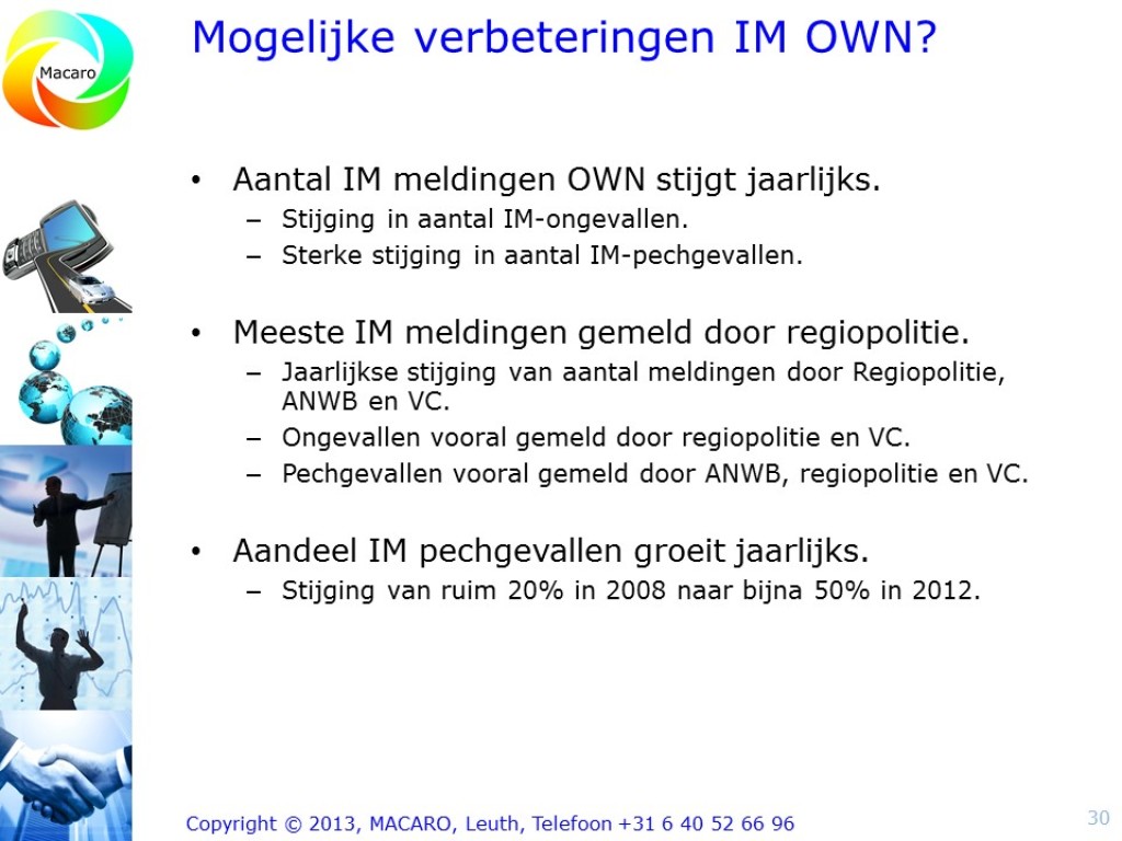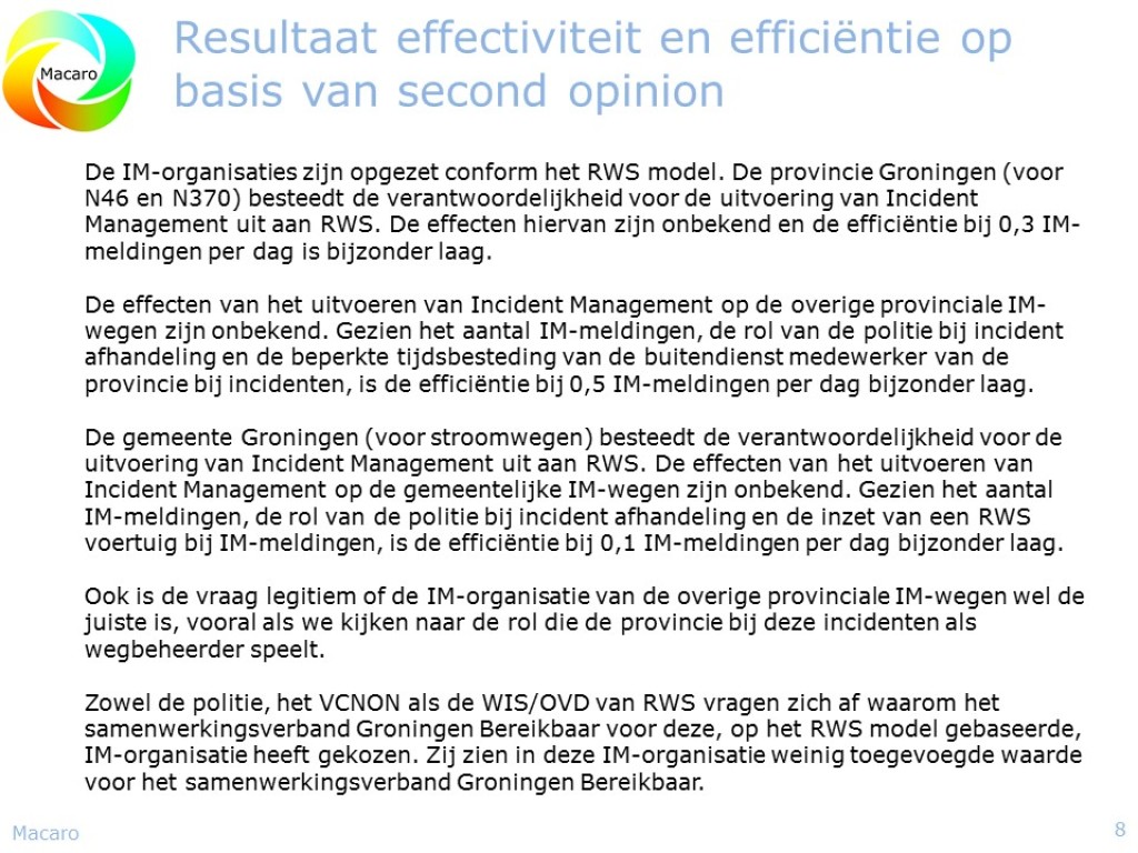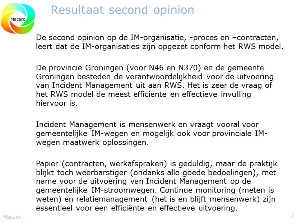 In de maanden juni en augustus heeft Macaro een onderzoek uitgevoerd naar de stand van zaken en ontwikkelingen van Incident Management bij de OWN wegbeheerders. De input gaat naar de IPO-werkgroep Efficiëntieverbetering gladheidbestrijding en Incident Management (IM). Doel van het onderzoek is om vanuit de inventarisatie een aantal speerpunten Incident Management OWN te benoemen, die het eindrapport van de IPO werkgroep Efficiëntieverbetering Gladheidbestrijding en IM minimaal zou moeten bevatten.