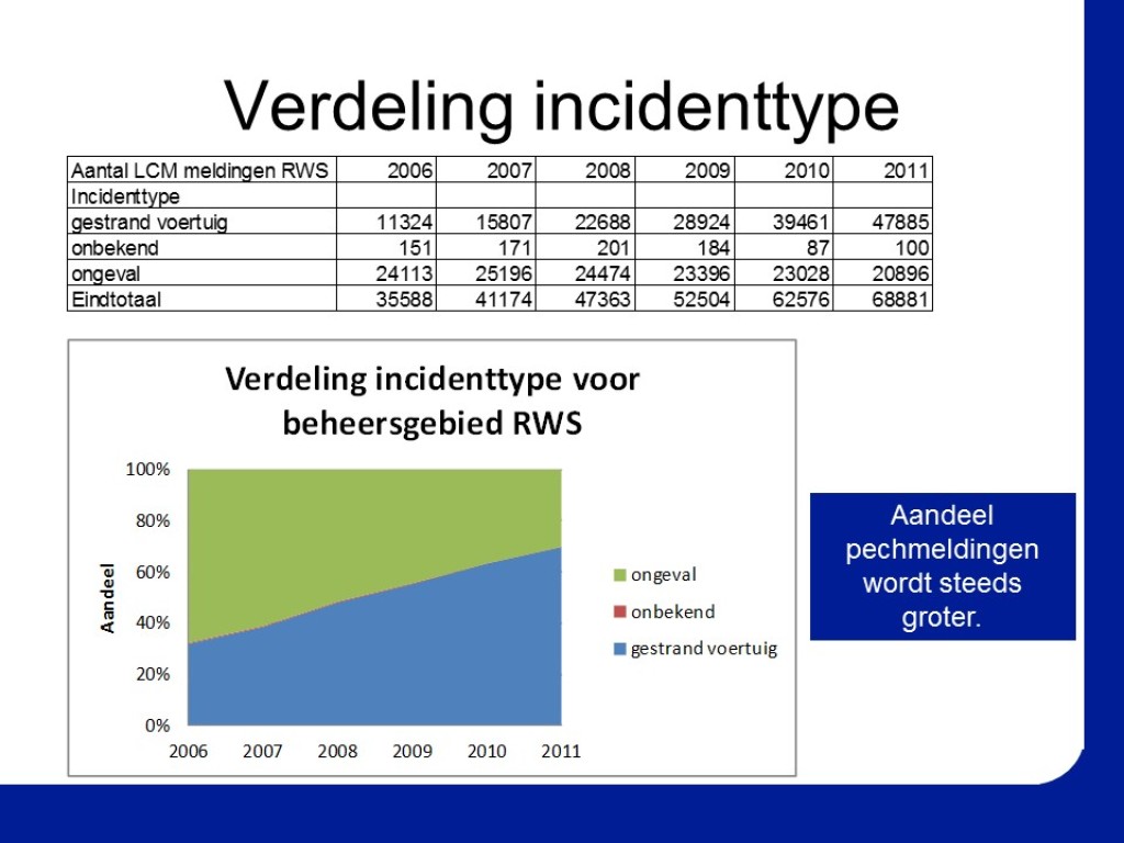 - Het incidenttype van het ongeval en het gestrande voertuig, de bergingsregeling vrachtauto (LVR) of personenauto (LPR)