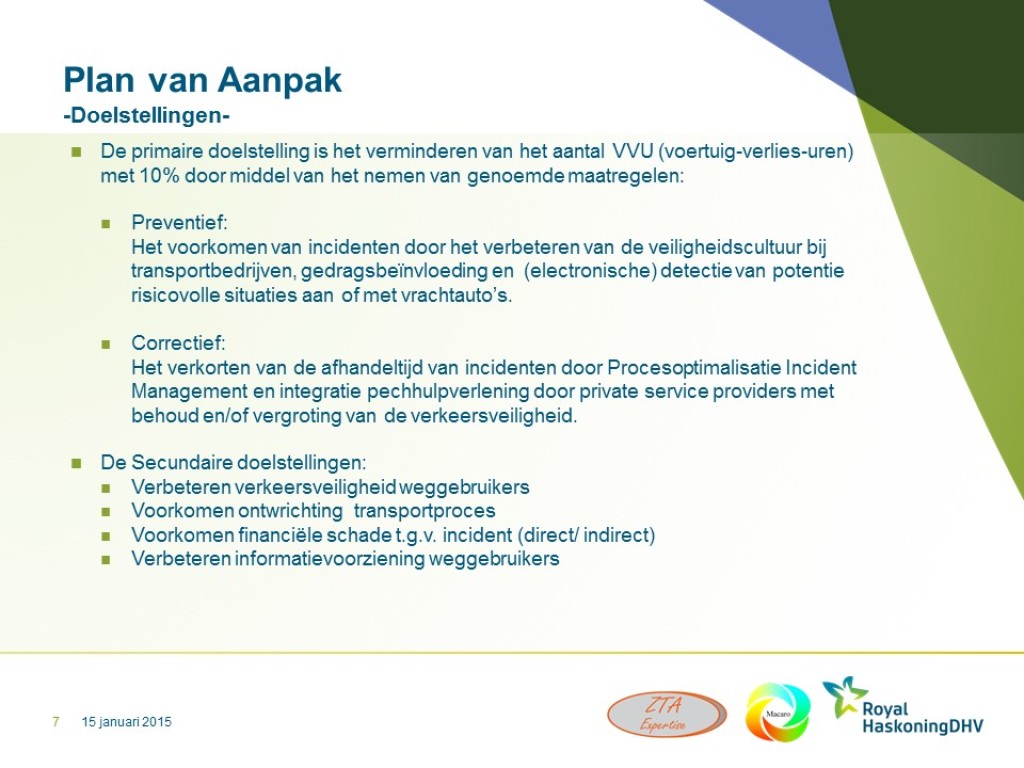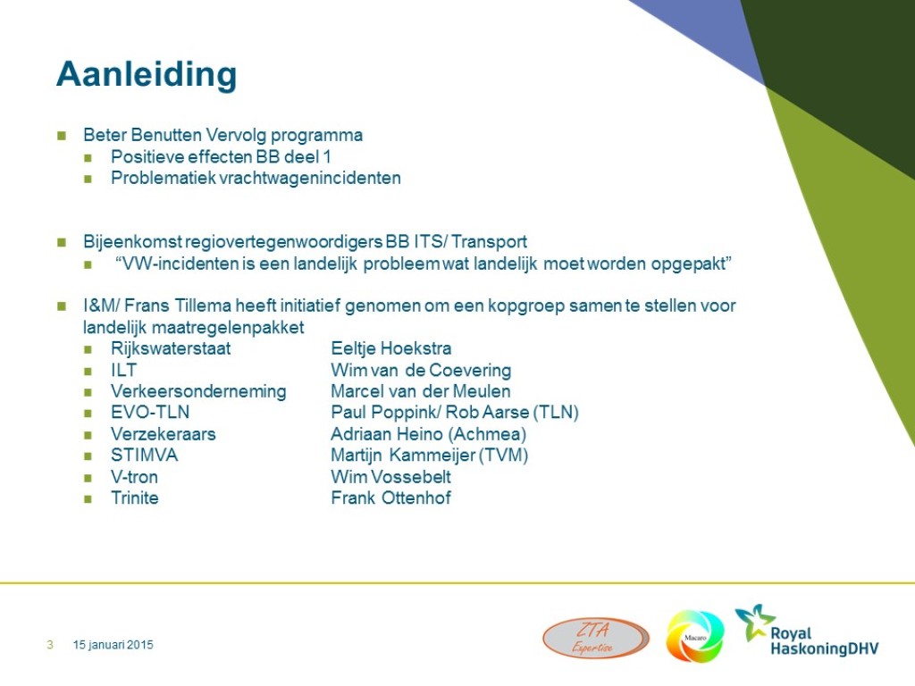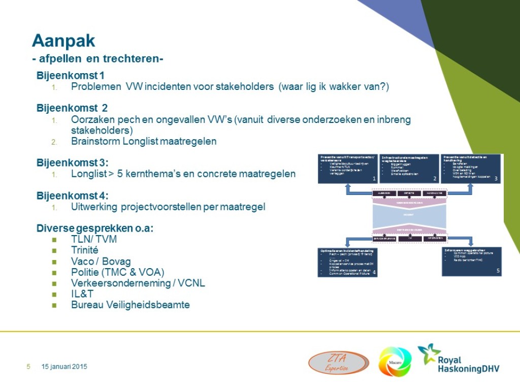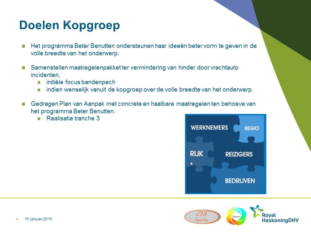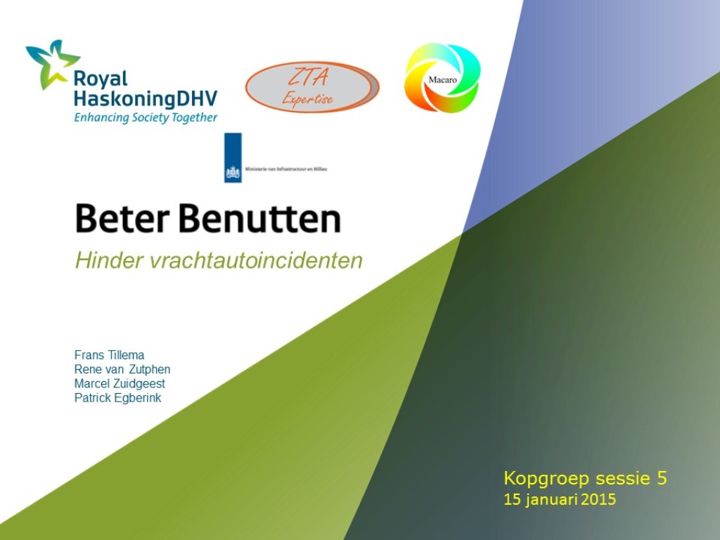 Samen met een tweetal andere Incident Management experts (RHDHV, ZTA Expertise) is René van Zutphen door het vervolgprogramma Beter Benutten ITS gevraagd een kopgroep samen te stellen van key-players binnen de transportwereld en Incident Management. Doel is om tot een aantal maatregelen te komen om de hinder als gevolg van vrachtauto-incidenten te verminderen. In een aantal sessies zijn branchespecifieke problemen vertaald in algemene preventieve- en correctieve maatregelen. Deze variëren van gedragsmaatregelen, technische maatregelen, infrastructurele maatregelen, procesmaatregelen tot informatie uitwisselingsmaatregelen. Resultaat is een overall plan van aanpak op basis van de maatregelen. Na commitment van de kopgroep leden is het vervolgprogramma Beter Benutten met het plan van aanpak naar de regio’s gegaan om ze tot uitvoer te krijgen. Een centrale projectmatige aansturing en coördinatie en een centrale monitoring zijn voorgesteld om een optimaal en meetbaar effect te bereiken.