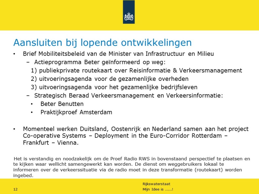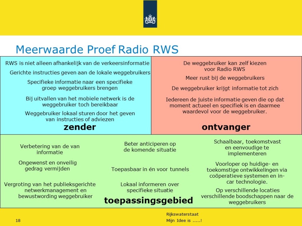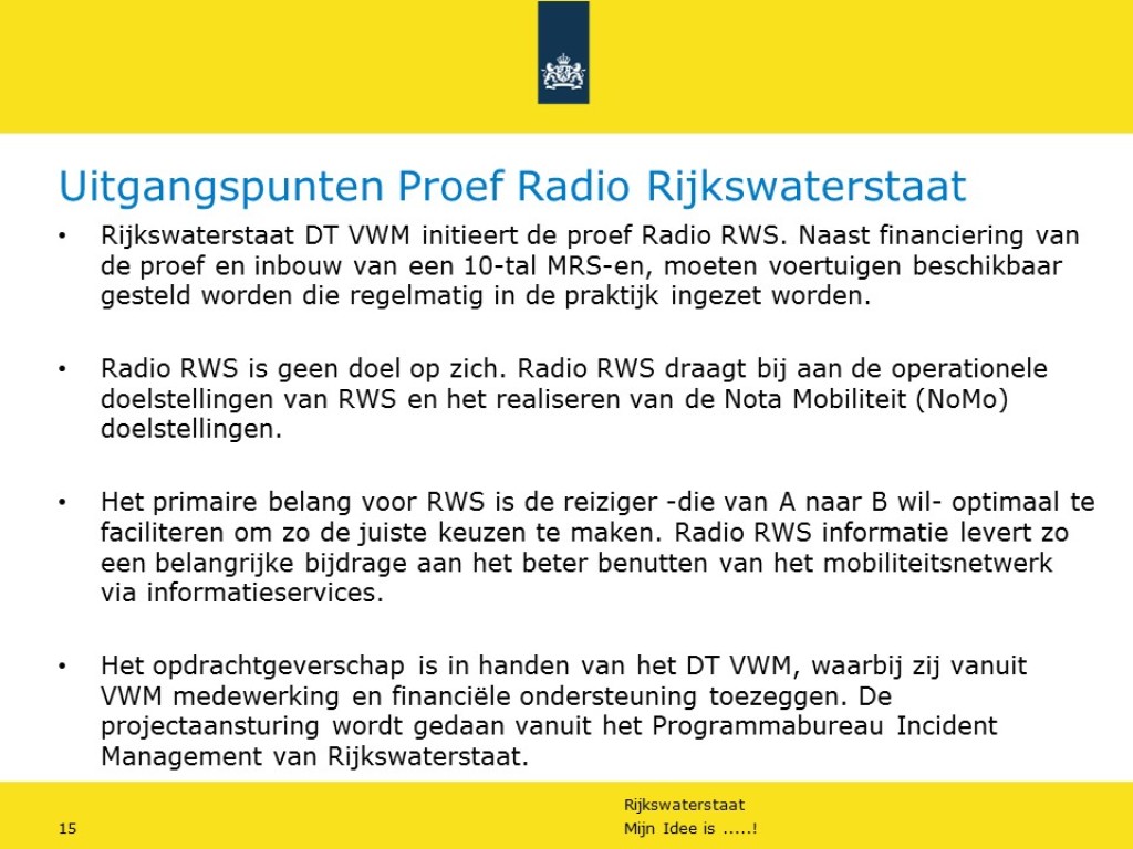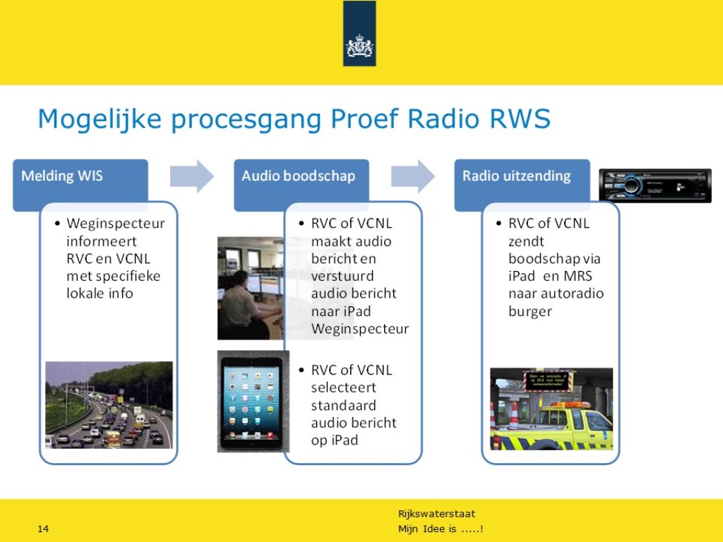 In het kader van Ideeënmanagement van Rijkswaterstaat VWM is het idee Proef Radio Rijkswaterstaat gehonoreerd. Hierbij worden op maat gesneden lokale radioboodschappen vanuit de Regionale Verkeerscentrales naar een beperkte groep weggebruikers verstuurd via een mobiel radiosysteem in het voertuig van de weginspecteur.