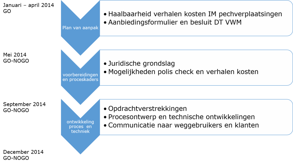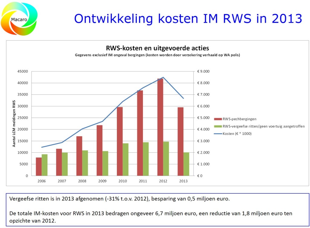 Samen met de stakeholders Rijkswaterstaat, SIMN, Verbond van Verzekeraars, de RDW en de ANWB, is door Macaro een plan van aanpak voor het verhalen van de kosten van pechhulp-verplaatsingen opgesteld. Het DT VWM heeft in september 2014 besloten om voorlopig niet de kosten van pechhulp-verplaatsingen bij personenauto’s op de eigenaren van het voertuig te verhalen. Het voornaamste argument om dit nu niet te doen, is de mogelijke imagoschade die kan optreden voor Rijkswaterstaat.