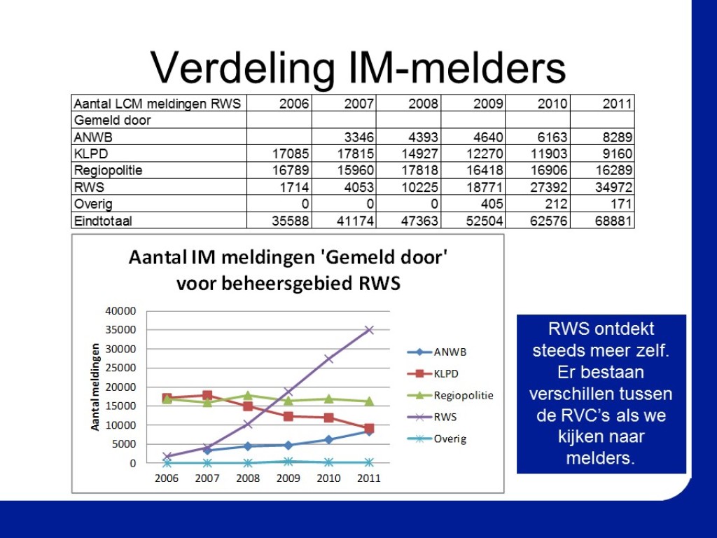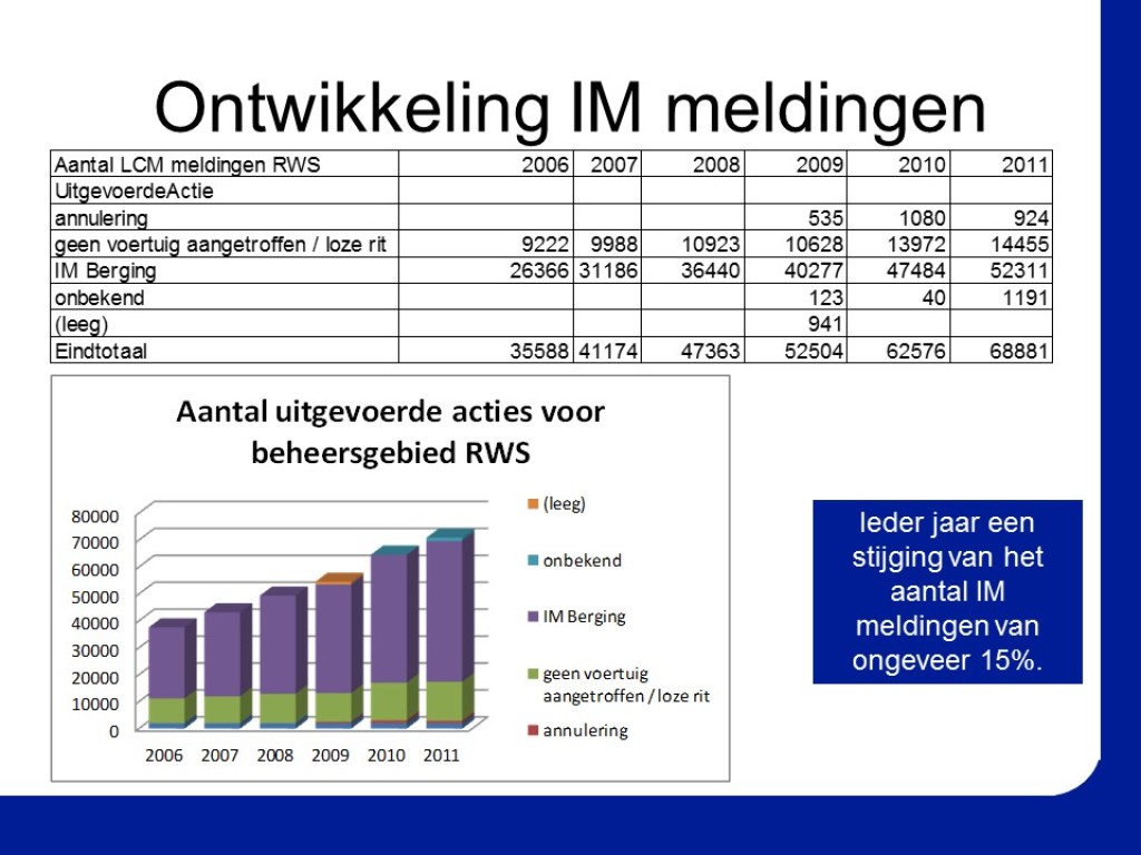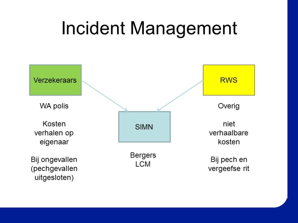 In opdracht van het Programma Bureau Incident Management heb ik alle overleggen van Rijkswaterstaat over verkeerscentrales en weginspecteurs bezocht om de geldende IM-beleidsregels en de Richtlijn Eerste Veiligheidsmaatregelen bij Incidenten strikter toe te passen. Doel was het aantal IM-pechverplaatsingen te verlagen, zonder dat dit ten koste ging van de veiligheid. Door continu te monitoren en de resultaten wekelijks terug te koppelen, is in 2012 een aanzienlijke kostenbesparing gerealiseerd. Door het vergroten van de bewustwording betreffende het proces en de kosten van de uitvoerende medewerkers, zette deze kostenbesparing zich structureel door in 2013.