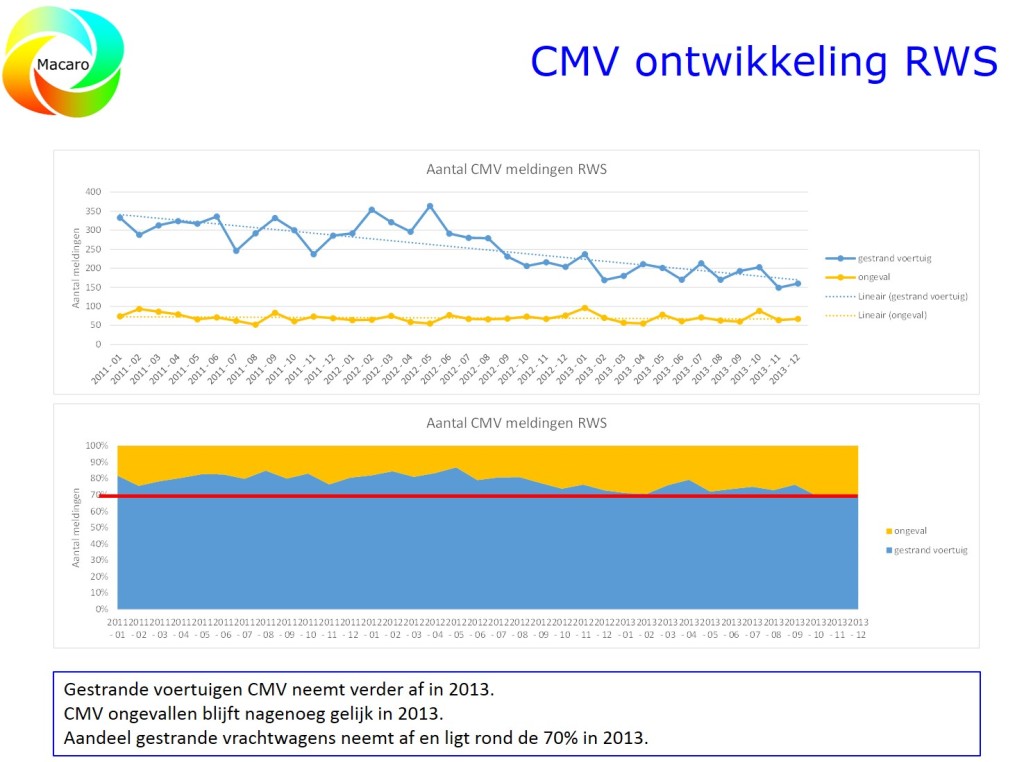 Macaro is gevraagd om via reguliere werkoverleggen zoveel mogelijk weginspecteurs en wegverkeersleiders op de hoogte te brengen van de instructies. Dit in samenwerking met het Programma Bureau Incident Management. De instructie wordt intern Rijkswaterstaat-geborgd op de Verkeerskundige Afspraken Site. In januari 2014 werd door Macaro een analyse gedaan en werd een rapport opgeleverd met de ontwikkelingen van het aantal IM-pechmeldingen per Rijkswaterstaat-regio in 2013.