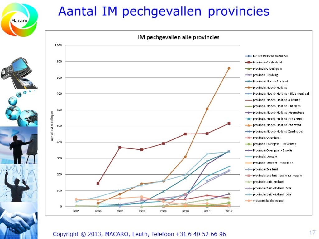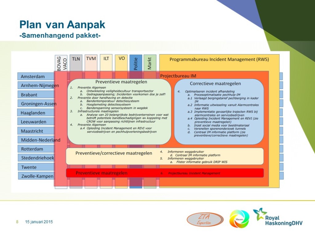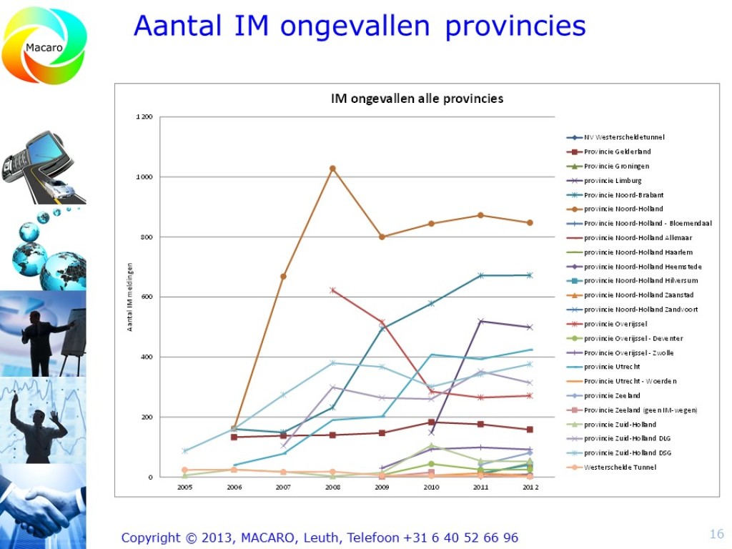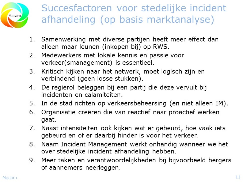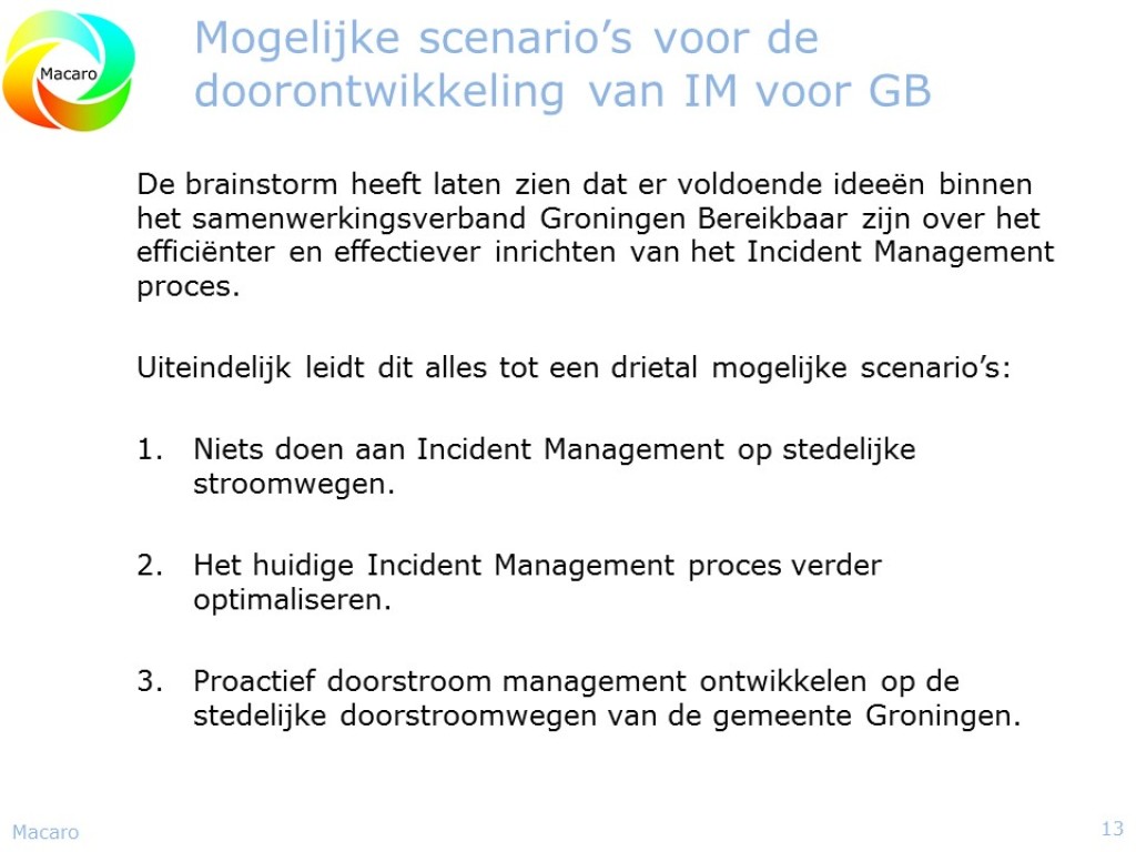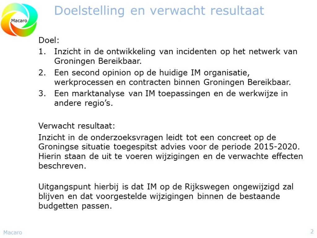 Redenerend vanuit de missie van de Dienst Beheer Infrastructuur, “Vlot en veilig over weg en water”, leek het de provincie Zuid-Holland tijd om een nieuwe stap te maken in de verdere professionalisering van de provincie Zuid-Holland in het algemeen en van het Incident management in het bijzonder. Macaro ontwikkelde een visie op het Incident Management en de verdere professionalisering daarvan binnen de provincie Zuid-Holland. Daarin werd rekening gehouden met ontwikkelingen binnen het Incident Managementproces en ontwikkelingen bij de Incident Managementpartners. Technische ontwikkelingen als eCall, InCar-systemen, autonome voertuigen en netcentrisch werken werden hierin tevens meegenomen. Resultaat was een rapport waarin een aantal mogelijke scenario’s werd beschreven om tot verdere professionalisering van het Incident Management binnen de Provincie Zuid-Holland te komen. In 2014 werd dit project verder vormgegeven.