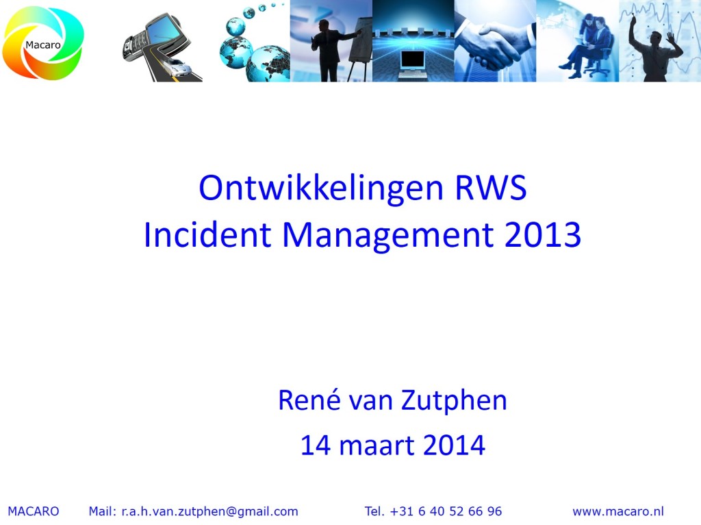 Voor Groningen Bereikbaar onderzoekt René van Zutphen de huidige situatie betreffende incidenten en files, het huidige proces, de organisatie en de contracten. Daarnaast voert hij een marktanalyse uit naar mogelijkheden om Incident Management effectief en efficiënt toe te passen op het netwerk van gemeente en provincie. De resultaten en aanbevelingen zijn beschreven in een adviesrapport, dat als basis dient voor de besluitvorming voor de nieuw op te stellen contracten eind 2015.