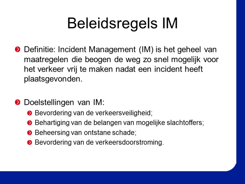 Incident Management is een van de meest effectieve instrumenten om voertuigverliesuren te beperken. Voor de prestatie die VWM levert op het gebied van Incident Management, wordt onderscheid gemaakt in IM-plus en niet-IM-plustrajecten. In de PIN op Aanrijtijden is vastgelegd dat de aanrijtijd van een weginspecteur in de spits op een IM-plustraject 15 minuten bedraagt en op een niet-IM-plustraject 30 minuten.